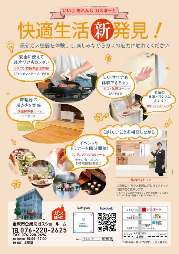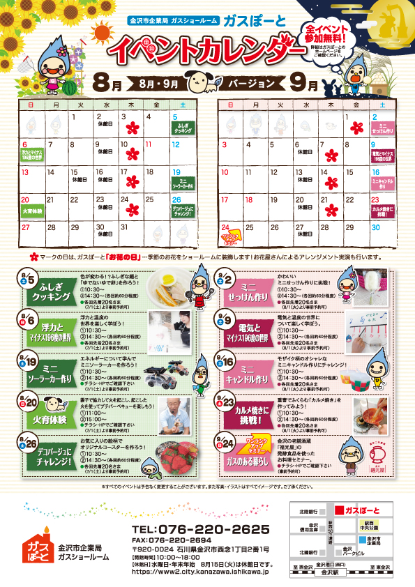 施設イベント情報ツール 2020年10月7日 最終更新日時 : 2024年11月11日 qsoffice 金沢企業局 ガスぽーとさま施設の施設紹介デザイン提案から制作物までです 施設紹介 施設紹介と、裏面には、フロアマップを制作 イベントカレンダー 2ヶ月事に行う集客イベント告知 イベントチラシ 料理・食材セミナーや子ども向けイベントなどに合わせて制作