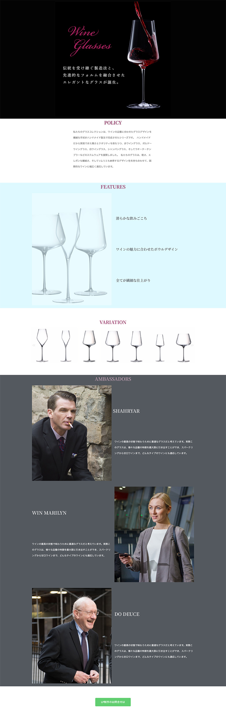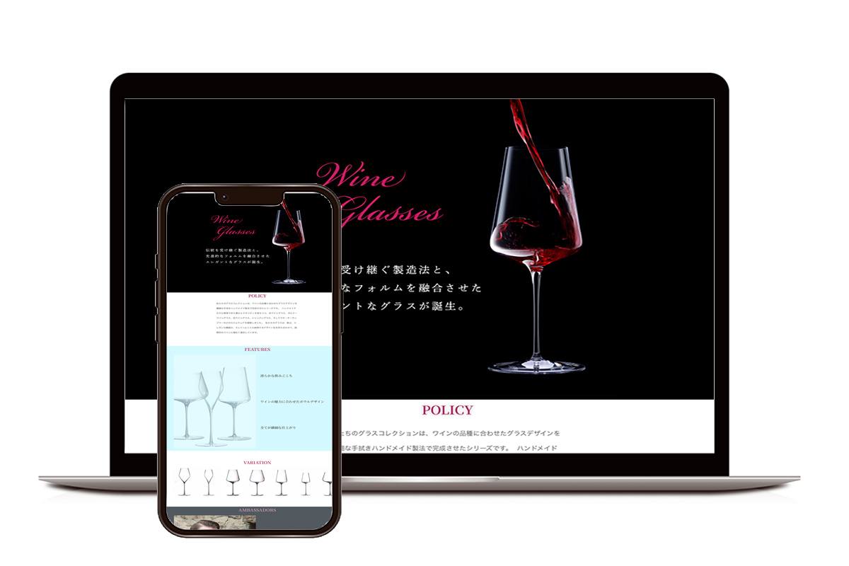 グラスにワインを注ぐ躍動感のイメージや、推薦者紹介などを利用して、ランディングページで提案できる動きのある演出のサンプルとして制作しました